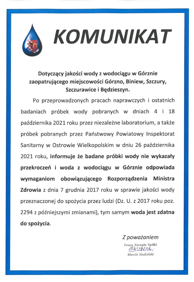 W dniu 5 marca 2026 roku (czwartek) w godzinach od 900 do 1500 wystąpi przerwa w dostawie wody z wodociągu w miejscowościach: Górzno, Biniew, Szczury, Szczurawice.
