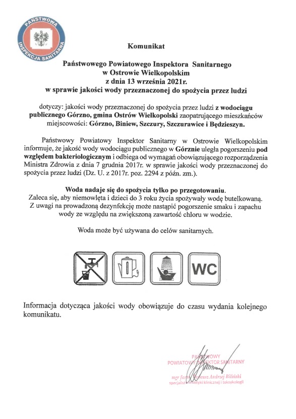 W dniu 5 marca 2026 roku (czwartek) w godzinach od 900 do 1500 wystąpi przerwa w dostawie wody z wodociągu w miejscowościach: Górzno, Biniew, Szczury, Szczurawice.