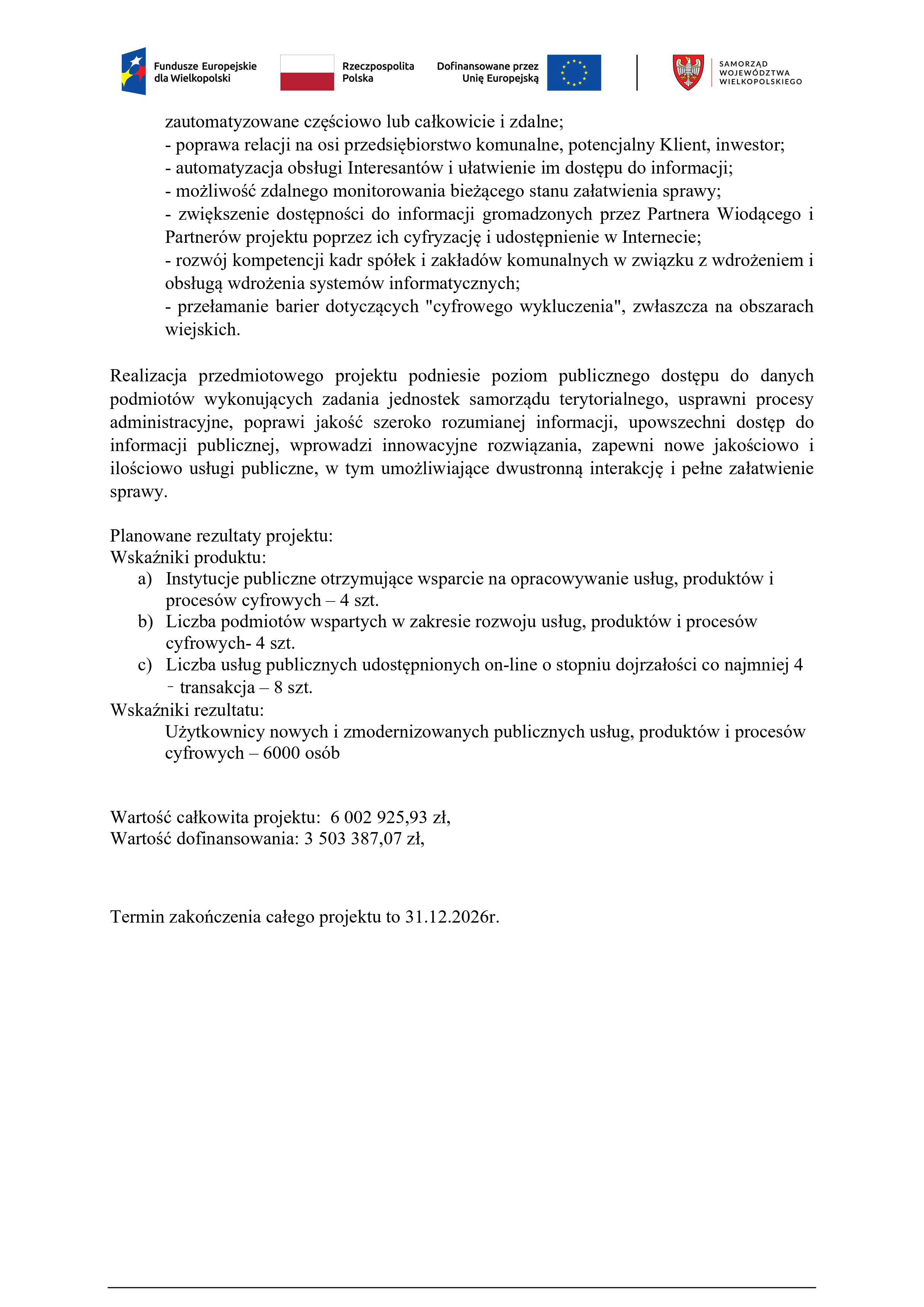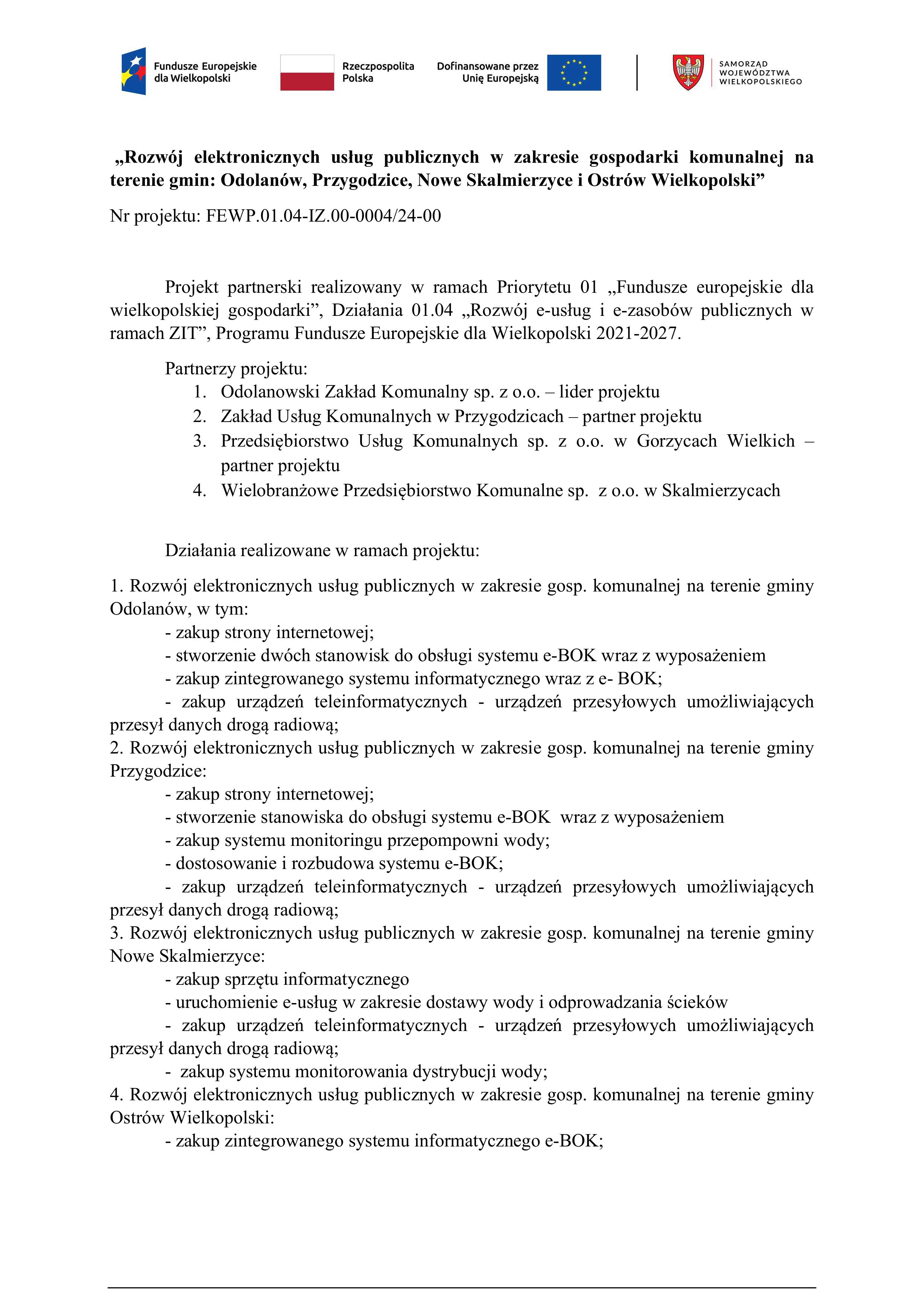 Wypełniając zapisy art. 39 ustęp 8 ustawy z dnia 28 kwietnia 2022 r. o zasadach realizacji zadań finansowanych ze środków europejskich w perspektywie finansowej 2021-2027 informuje się, że Przedsiębiorstwo Usług Komunalnych Sp. z o.o. w Gorzycach Wielkich przystąpiło  w dniu 17 maja 2024r. do realizacji projektu partnerskiego pn.: „Rozwój elektronicznych usług publicznych w zakresie gospodarki komunalnej na terenie gmin: Odolanów, Przygodzice, Nowe Skalmierzyce i Ostrów Wielkopolski”, w ramach którego Odolanowski Zakład Komunalny sp. z o.o.  w Odolanowie jest partnerem wiodącym.
